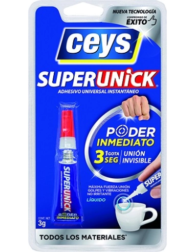 SUPERUNICK PODER INMEDIATO ES EL ADHESIVO UNIVERSAL INSTANTANEO DE MAXIMAS PRESTACIONES Y REPARACIONES INVISIBLES EN 3 SEGUNDOS. FUERTE, RAPIDO Y SEGURO. PEGA TODOS LOS MATERIALES. RESISTE GOLPES Y VIBRACIONES. SIN OLOR, NO IRRITANTE
