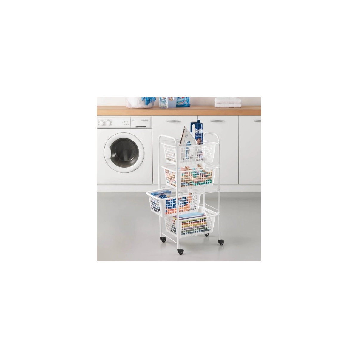 Carro multiusos de alambre plastificado blanco con ruedas y 4 cestas extraíbles. Compacto y funcional, ideal para organizar espacios en el hogar u oficina.