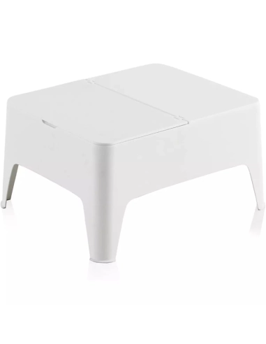 Mesa auxiliar Alaska en color blanco, fabricada en España con plástico reciclado. Ligera, resistente, apilable y con cajón de almacenaje. Ideal para exterior o interior.