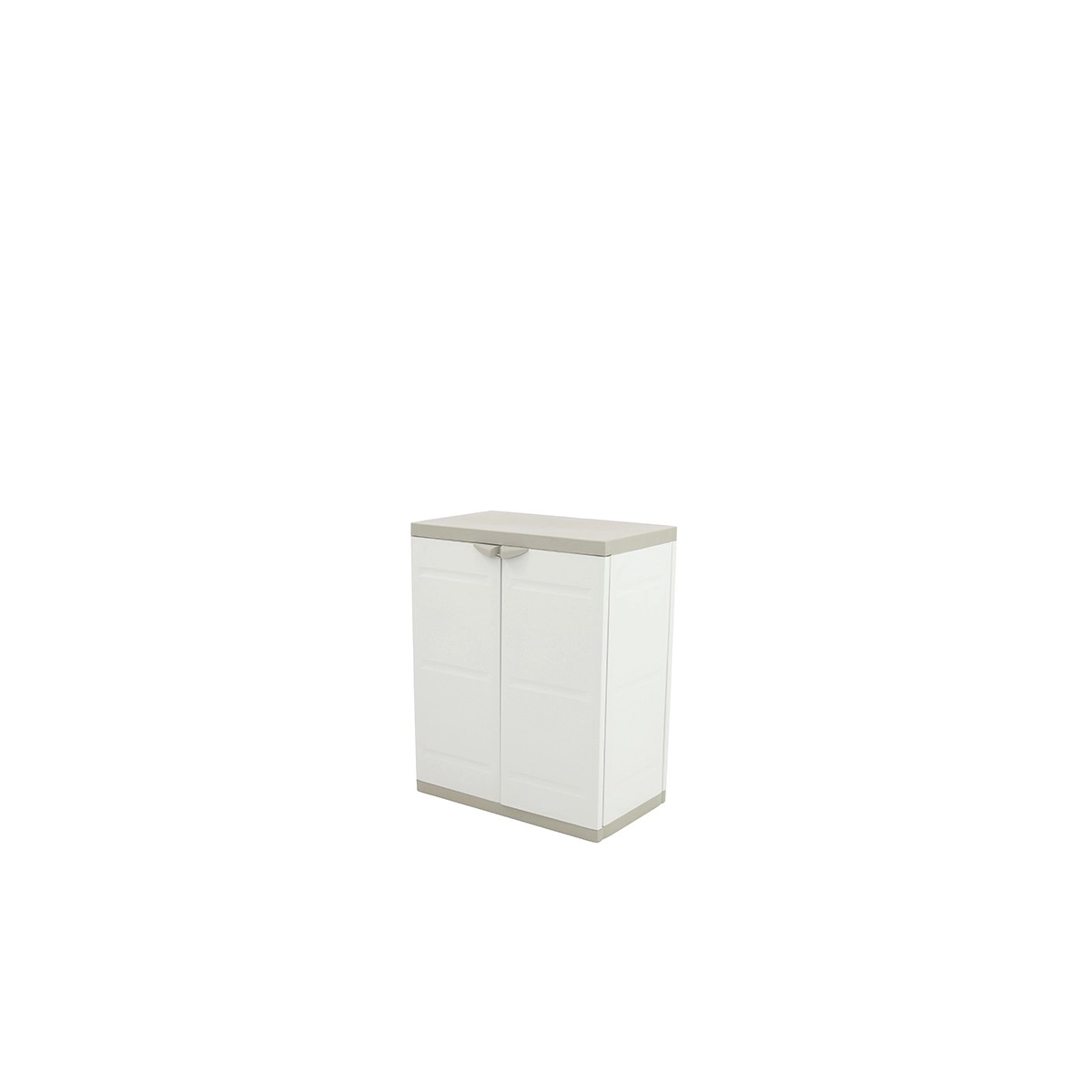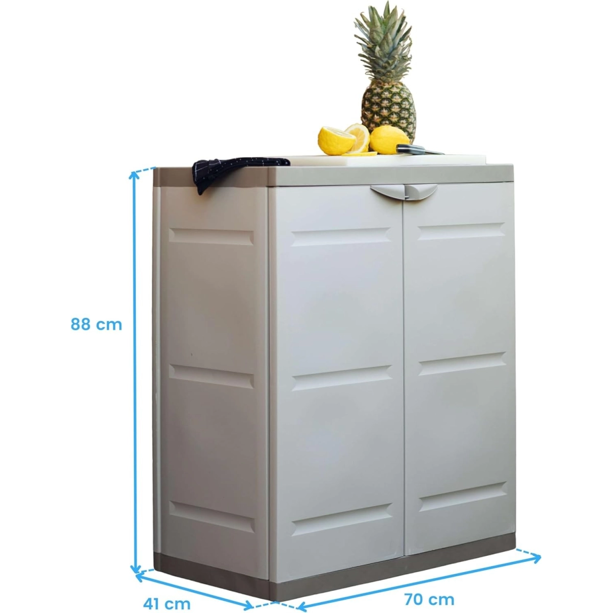 El medio armario PLASTIKEN de 70×44×88 cm cuenta con dos baldas interiores que ofrecen un almacenamiento práctico y ordenado. Fabricado en material resistente, ideal para garaje, lavadero o terraza.