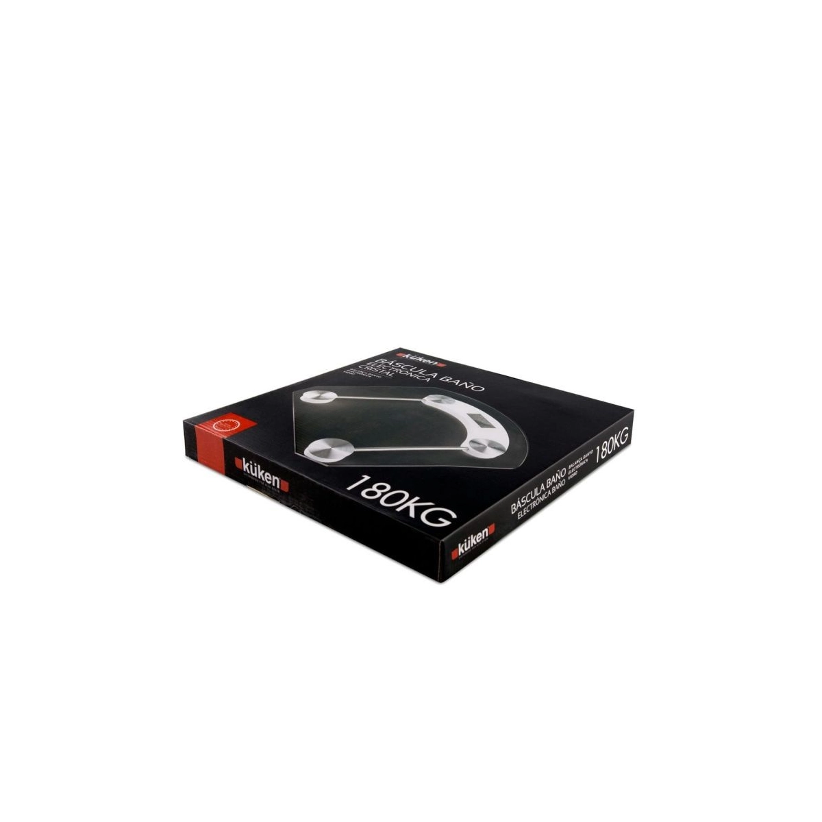 Báscula digital KUKEN con plataforma de cristal templado y capacidad de hasta 180 kg. Medición precisa y diseño moderno para uso diario en el baño.