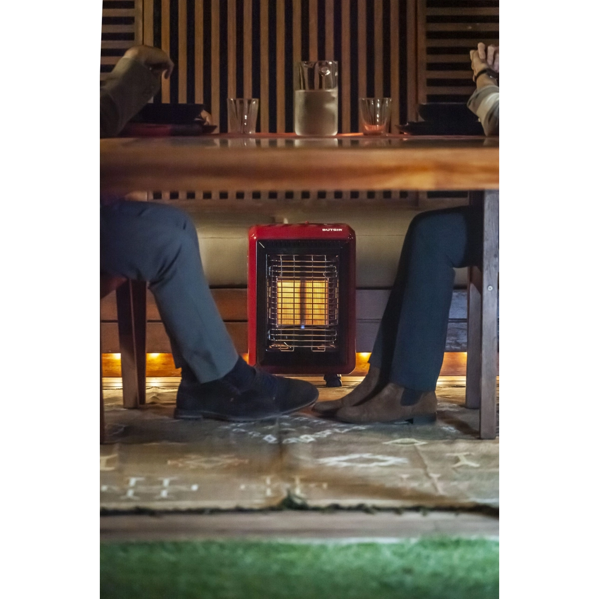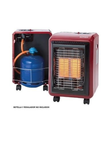 Estufa de gas infrarrojos Butsir compacta en color granate con 2 niveles de potencia. Ideal para calentar estancias rápidamente gracias a su tecnología de infrarrojos. Incluye ruedas multidireccionales para un transporte cómodo y encendido piezoeléctrico seguro. Compatible con botellas de gas azules (tipo Campingaz).