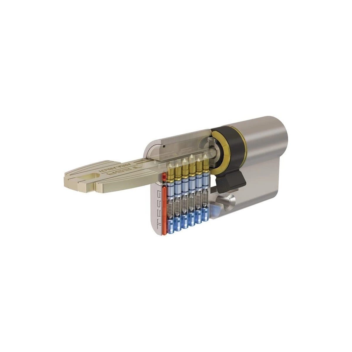El cilindro seguridad T60 30 x 45 leva R15 5 llaves acabado latonado de Tesa combina seguridad y estilo clásico para tu puerta. Su diseño robusto y sus avanzadas características de seguridad te brindarán tranquilidad, mientras que su elegante acabado latonado aportará un toque de distinción a tu hogar.