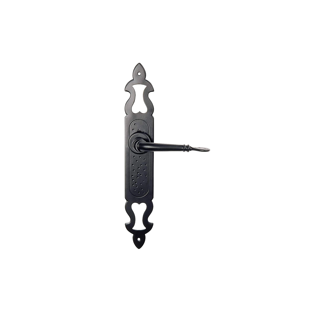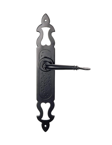 Elegante manivela automática de hierro forjado con diseño de trébol y escudo largo calado. Ideal para puertas exteriores y estilos rústicos.