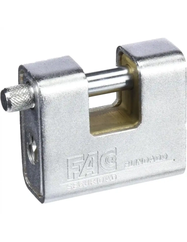 Candado de alta seguridad FAC, modelo rectangular y BLINDADO. El cuerpo macizo de latón de 60 mm protege el arco contra cizallas y palancas. La construcción blindada minimiza el acceso a los puntos débiles, siendo ideal para asegurar persianas metálicas, trasteros o puertas exteriores.