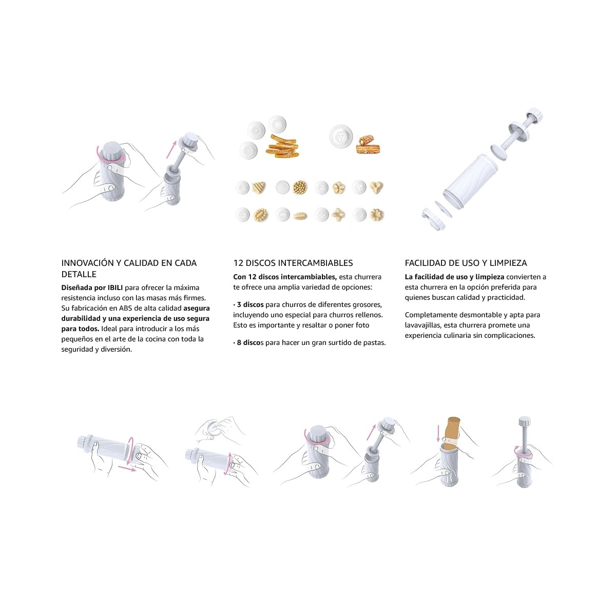 | Versatilidad | Incluye 12 discos para churros y pastas variadas. |
