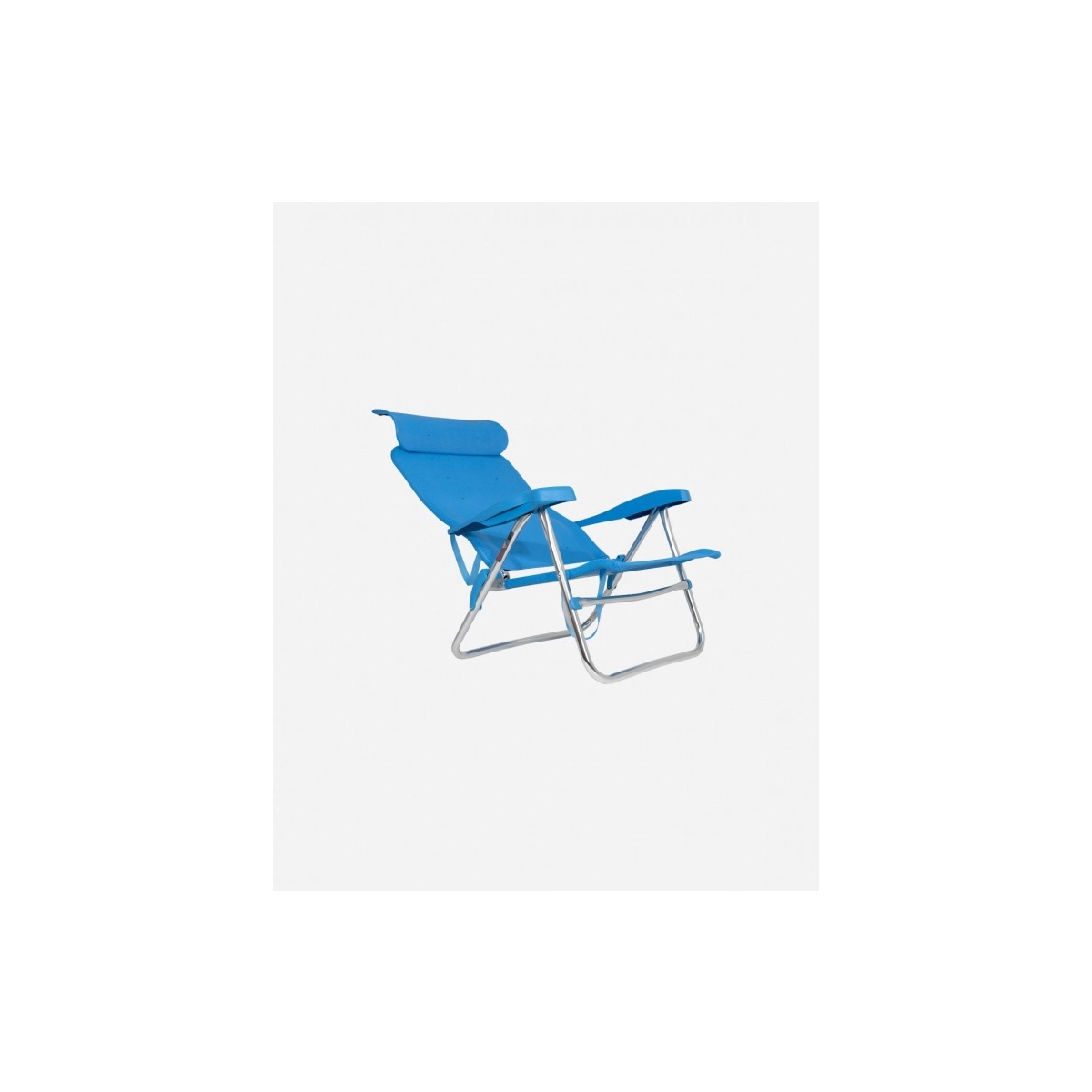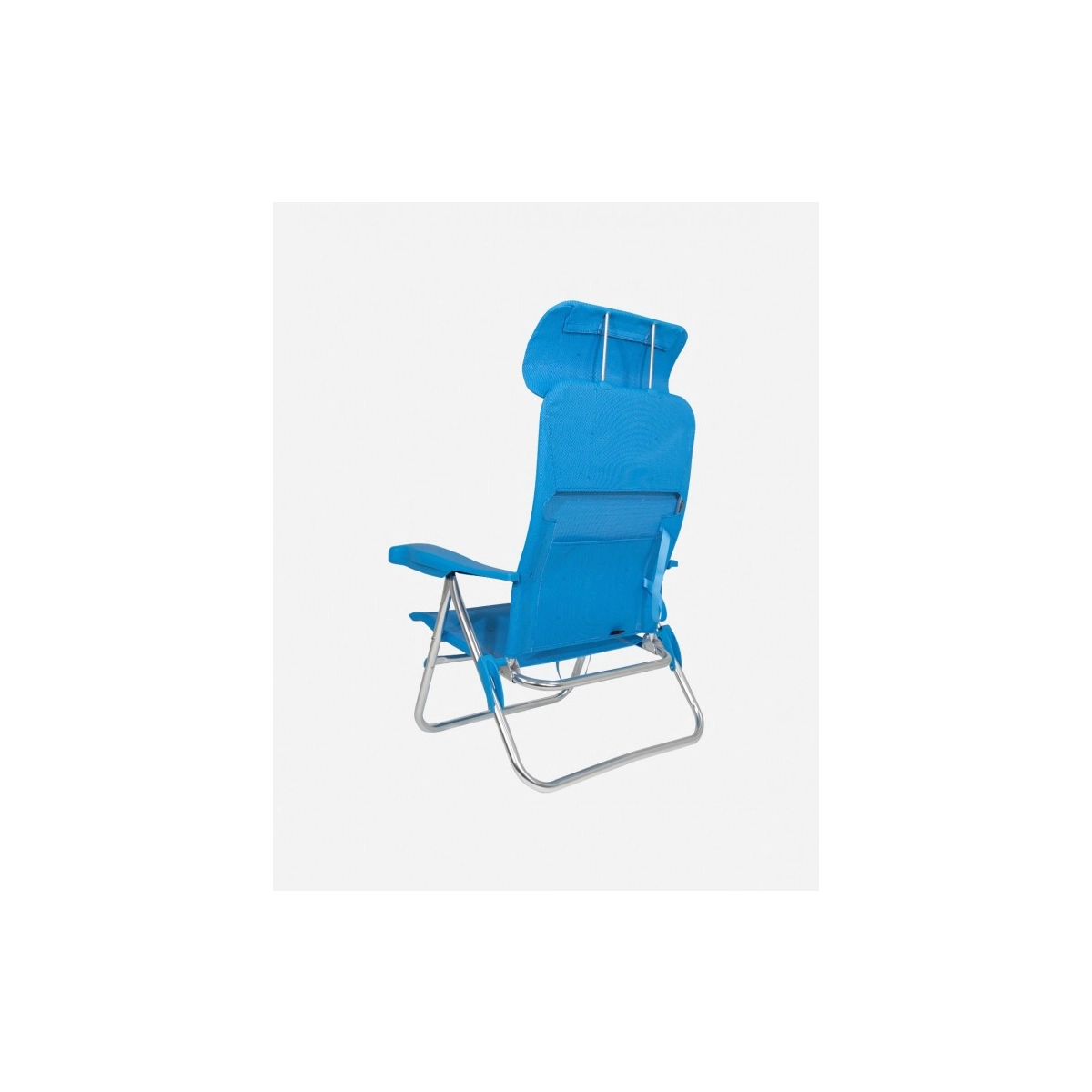 Silla de playa baja y reclinable en 7 posiciones, con cabezal ergonómico regulable en altura y diseño compacto de fácil transporte. Resistente hasta 110 kg.