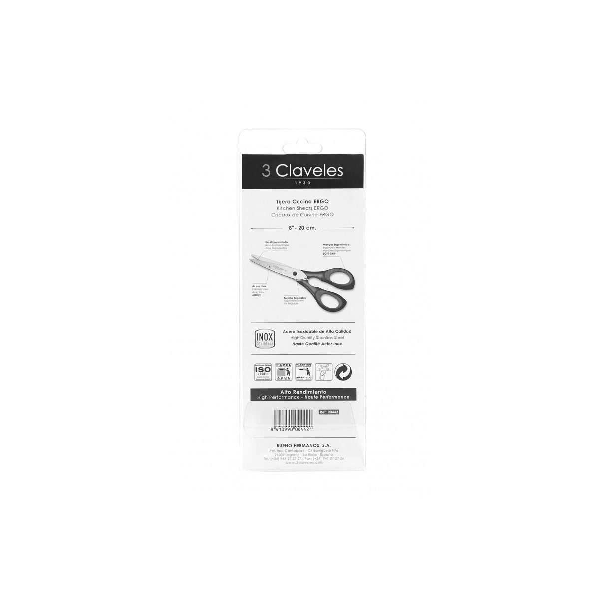 La tijera de cocina 3 CLAVELES Ergo 00442 de 20 cm ofrece ergonomía, seguridad y filo duradero, perfecta para cortar alimentos y abrir envases.