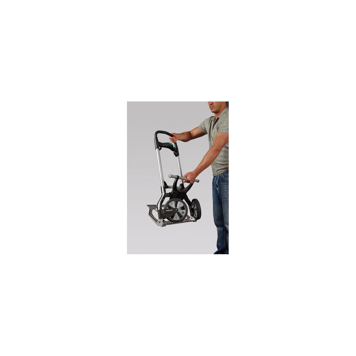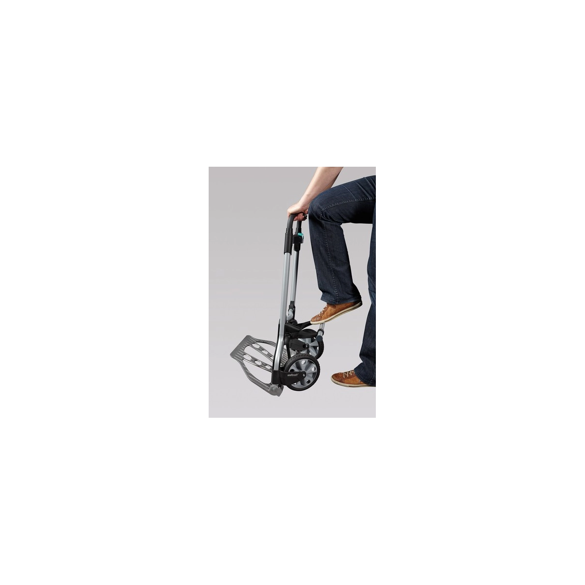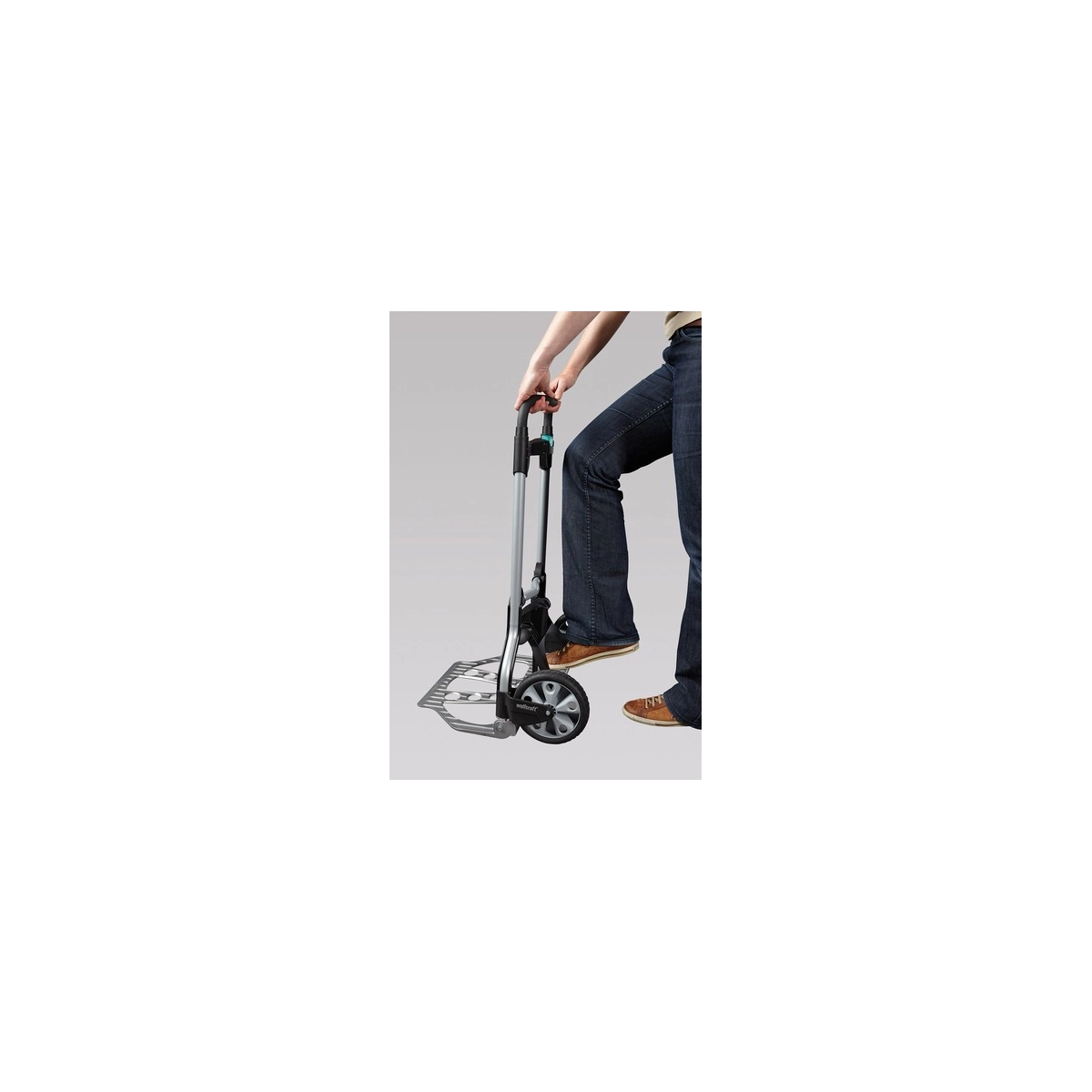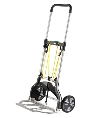 Carretilla profesional Wolfcraft TS 850 diseñada para el transporte cómodo y seguro de cargas de hasta 100 kg. Su sistema de plegado rápido y asa deslizable con botón central la convierten en la herramienta perfecta para mover cajas, muebles o materiales pesados en escaleras y exteriores sin esfuerzo.