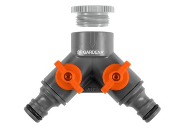 El distribuidor doble GARDENA 940-26 permite conectar dos accesorios a un mismo grifo de 33,3 mm, con caudal regulable de forma independiente.