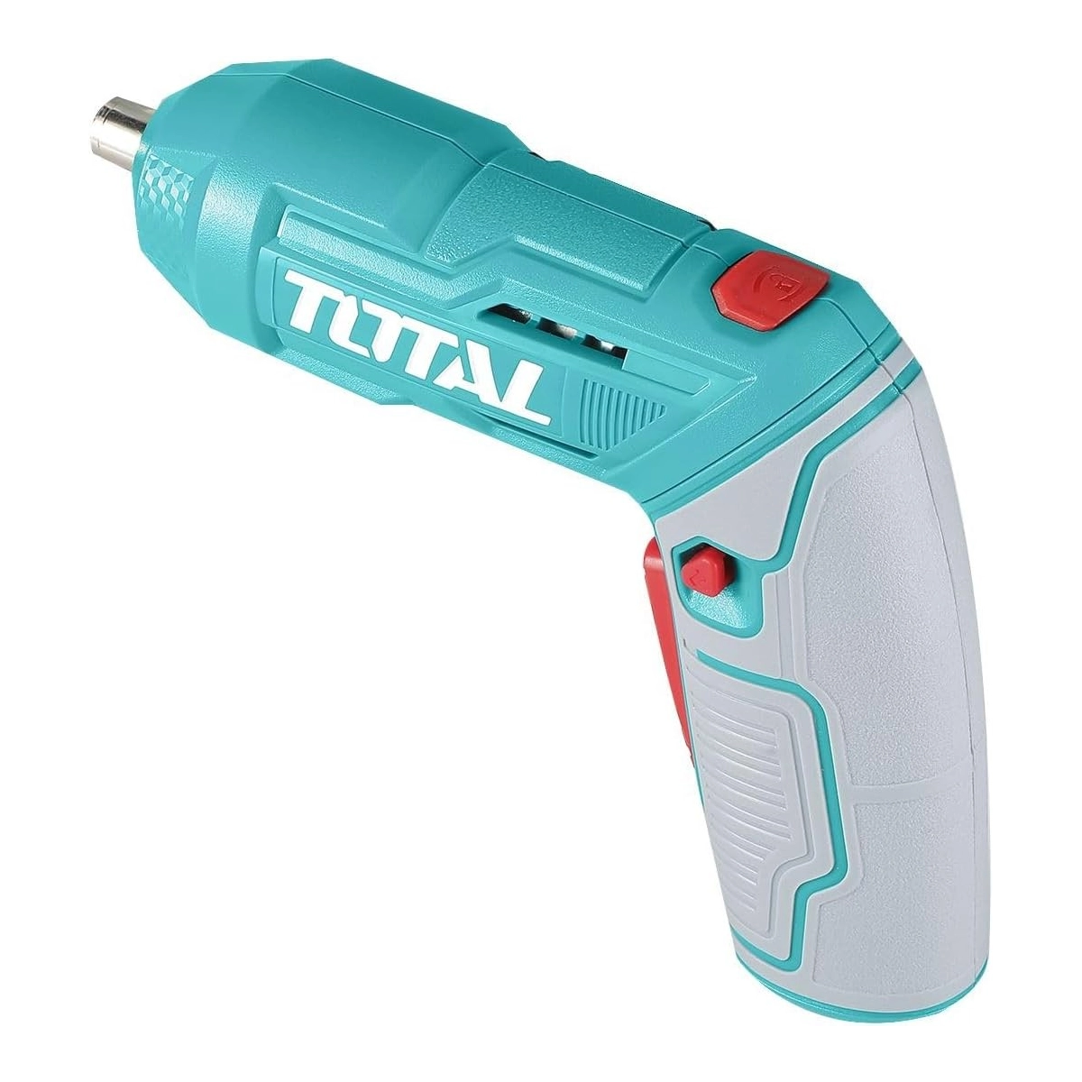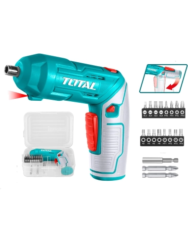 El Atornillador a Batería TOTAL 4V - 41257 es una herramienta eléctrica portátil diseñada para realizar tareas de atornillado y desatornillado de manera rápida y eficiente. Su tamaño compacto y ligero lo hacen ideal para trabajos domésticos, de bricolaje y pequeñas reparaciones.