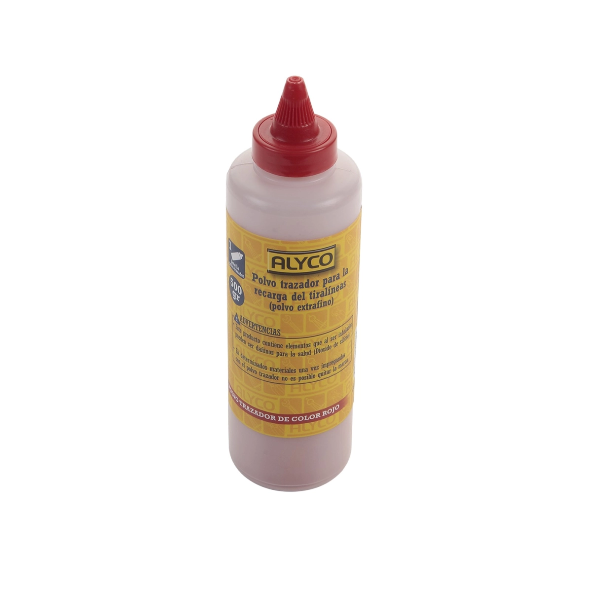 Polvo trazador rojo ALYCO de alta visibilidad para tiralíneas. Presentación en bote de 500 g. Ideal para trabajos de marcación precisa.