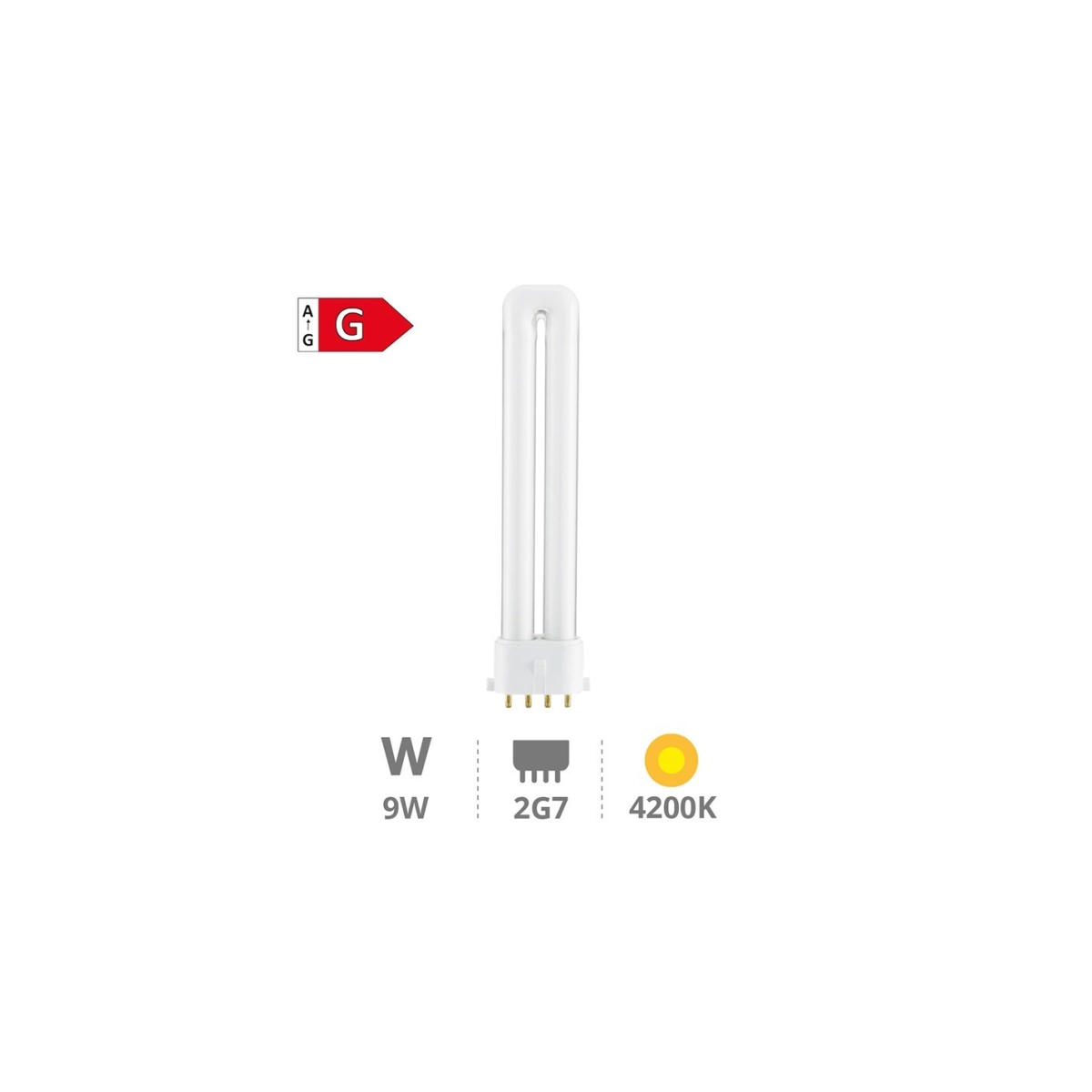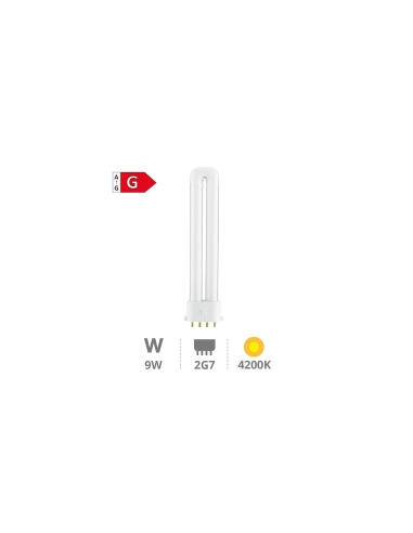 Bombilla de bajo consumo GSC Evolution 9W, luz blanca fría (4200K), casquillo 2G7. Ideal para oficinas, cocinas y talleres.