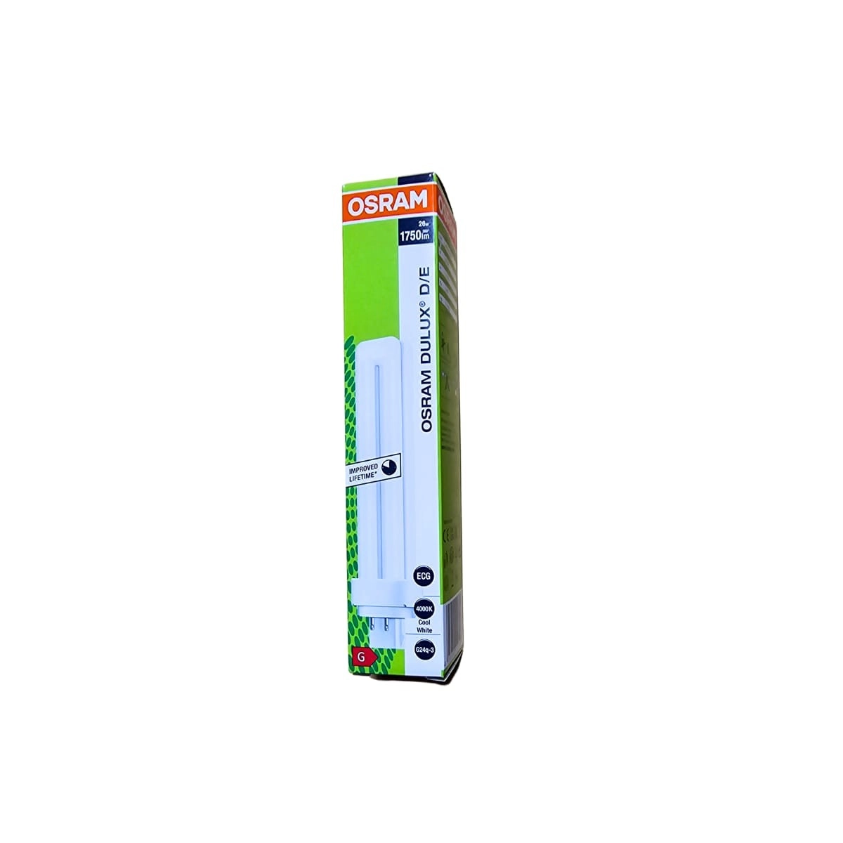 Bombilla Osram Dulux D/E 26W, casquillo G24q-3, 4000K, y 1750 lúmenes. Perfecta para espacios que requieren luz blanca fría.