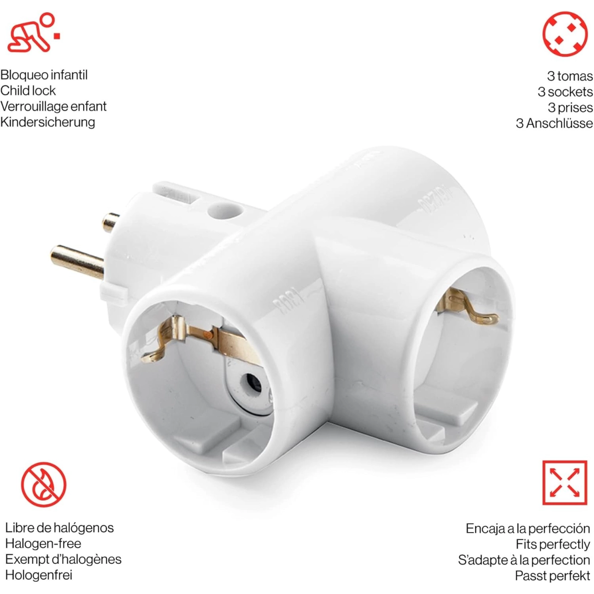 Perfecto para hogares, oficinas y entornos profesionales, este adaptador permite conectar hasta tres dispositivos eléctricos de forma segura y sin sobrecargar la instalación.