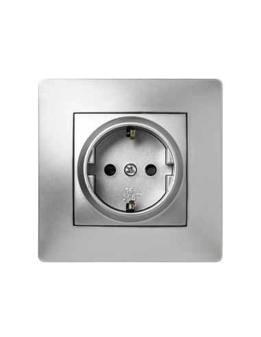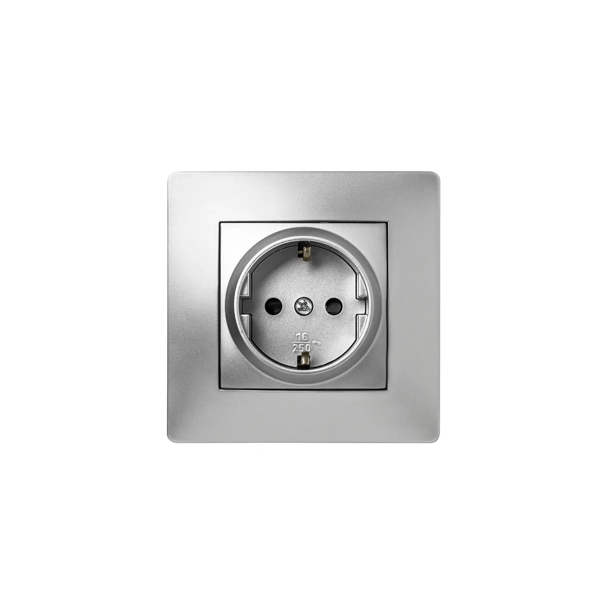 Enchufe empotrable tipo Schuko de la serie Habitat 15 de Famatel, en elegante color aluminio. Diseñado para instalaciones seguras de 16A y 250V, ideal para hogares y oficinas modernas.