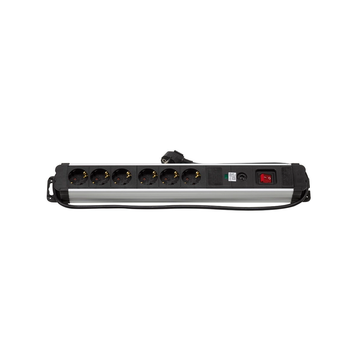 Regleta SIMON con 6 tomas Schuko 16A 250V, interruptor luminoso y protección contra sobretensiones. Incluye cable de 1,5 metros y acabado en color negro y aluminio, ideal para hogar y oficina.