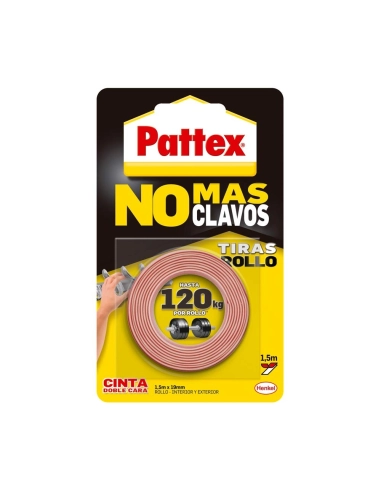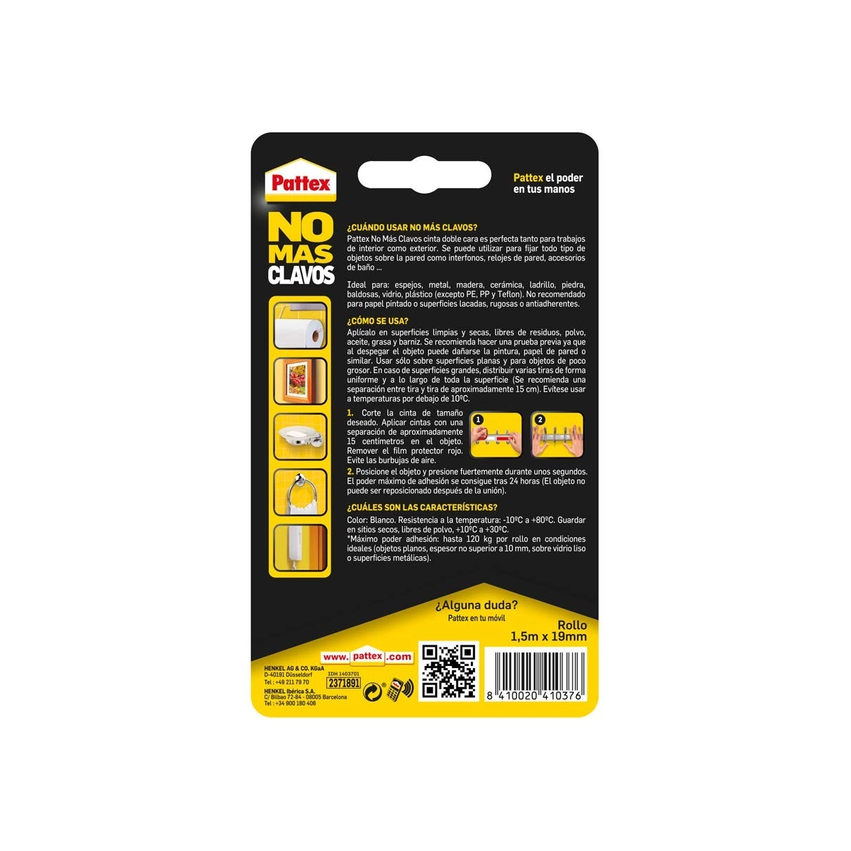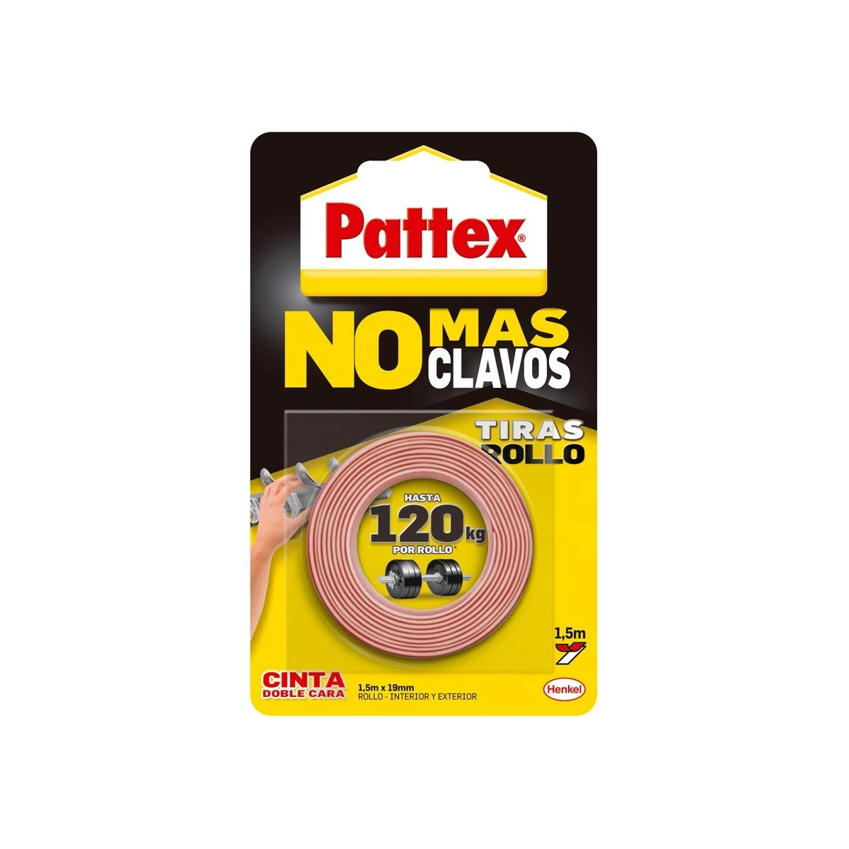 Pattex No Más Clavos Cinta, cinta adhesiva para aplicaciones permanentes, cinta de doble cara extrafuerte, adhesivo de montaje para interior y exterior, 19 mm x 1,5 m.