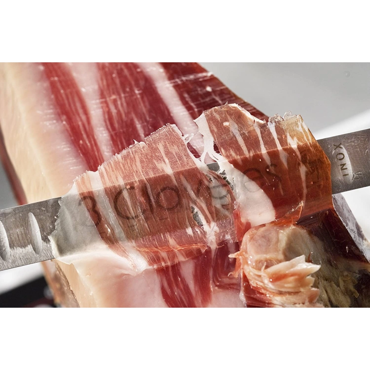 LA HOJA ALVEOLADA FACILITA EL CORTE EVITANDO QUE EL JAMON SE QUEDE ADHERIDO A LA HOJA