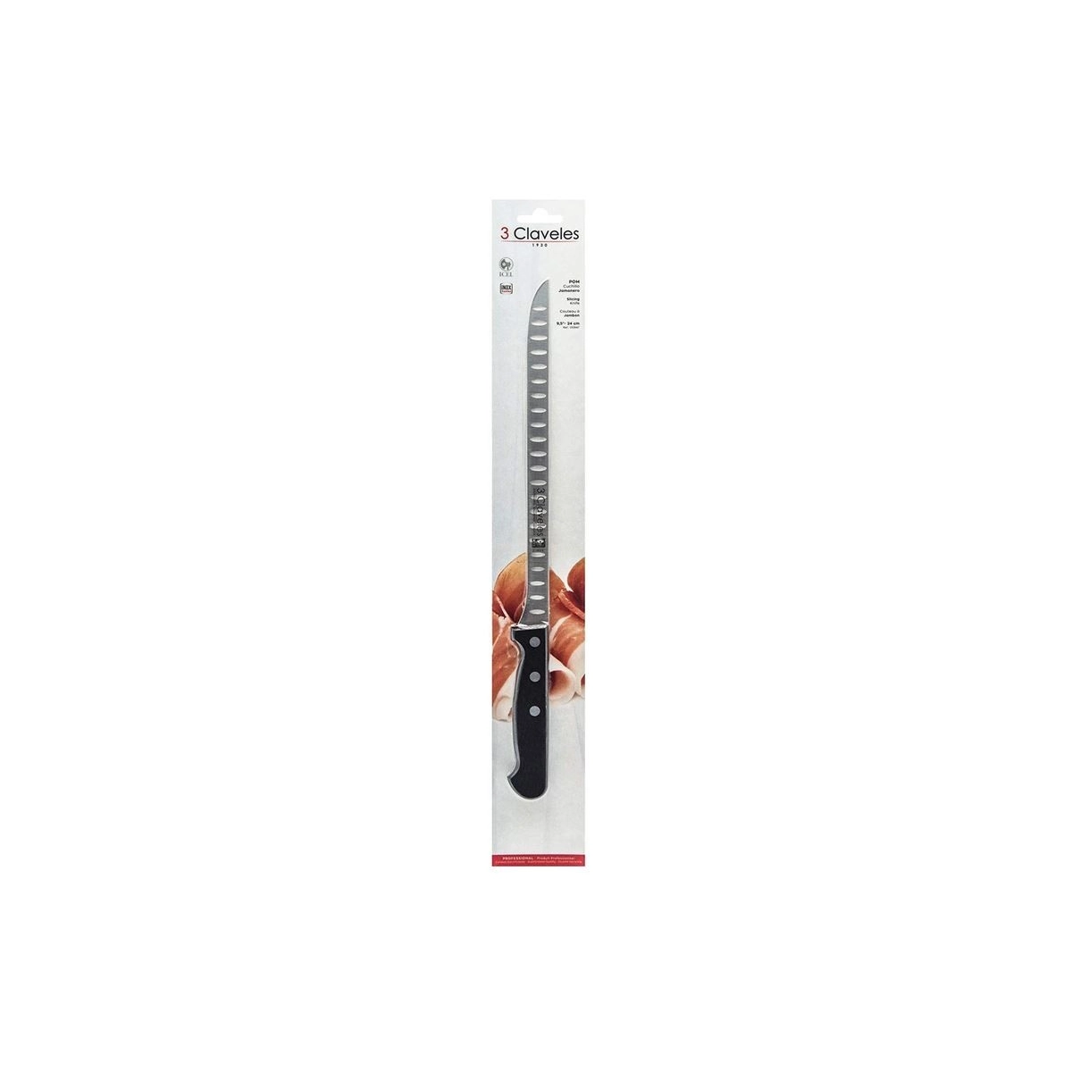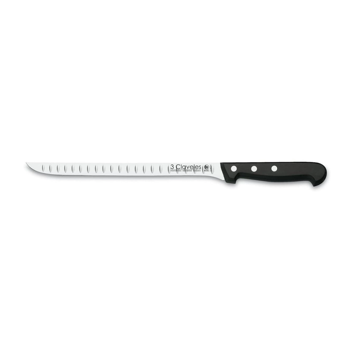 El cuchillo jamonero alveolado de 3 CLAVELES (24 cm) es la herramienta ideal para lograr cortes finos, precisos y sin esfuerzo en jamón y embutidos.