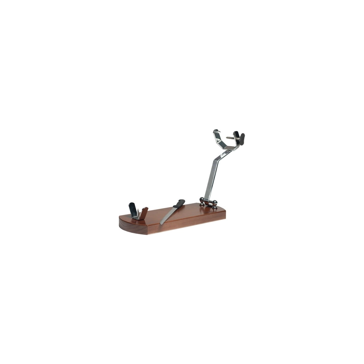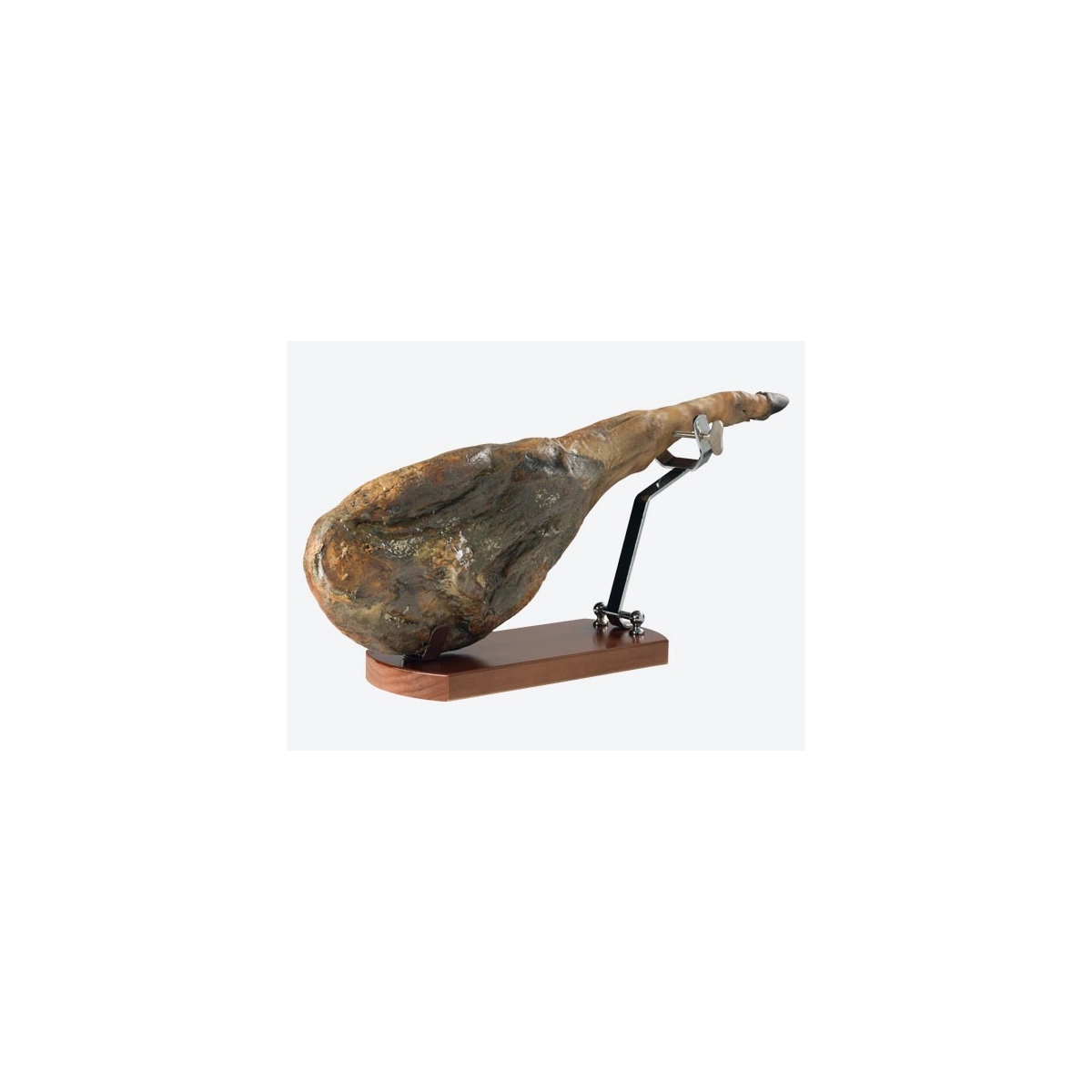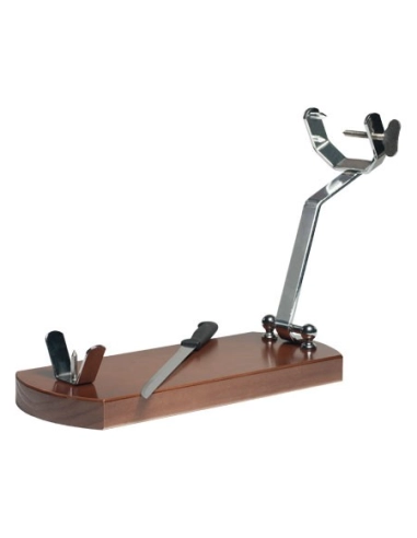 - SOPORTE JAMONERO FABRICADO CON MADERA DE PINO SU BASE, LOS HERRAJES Y PINCHOS SON DE ACERO CROMADO