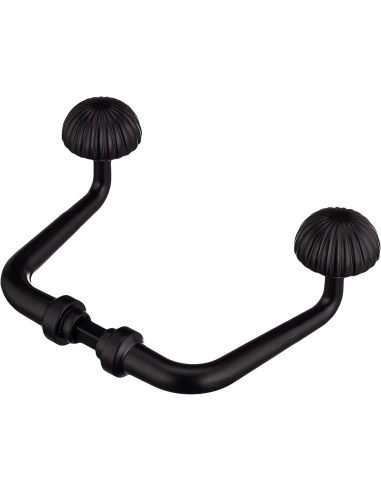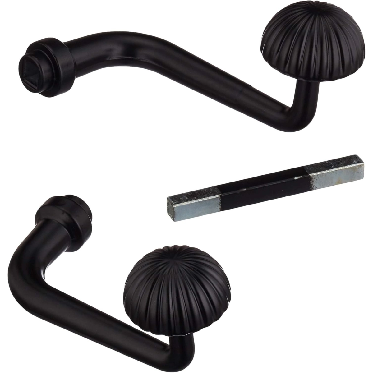 Este juego de manivelas es una pieza de herrería artística que combina funcionalidad y estética tradicional. El diseño se caracteriza por un pomo con textura acanalada (estriado) que facilita el agarre y una elegante curva en la palanca que aporta ergonomía sin perder el carácter robusto de la forja.