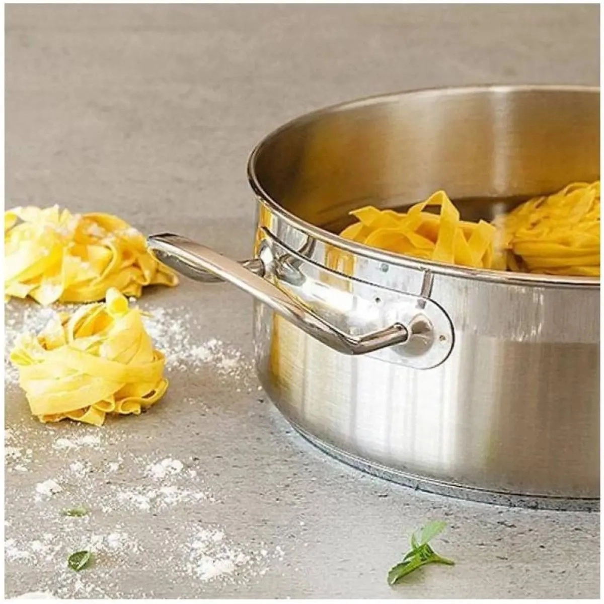 Cocina como un profesional con la Cacerola BRA Profesional. Fabricada íntegramente en acero inoxidable de máxima calidad, esta pieza está diseñada para ofrecer una durabilidad extrema y una distribución del calor perfecta. Su acabado pulido y su tapa de acero la convierten en la herramienta indispensable para cualquier tipo de cocina, incluidas las de inducción.