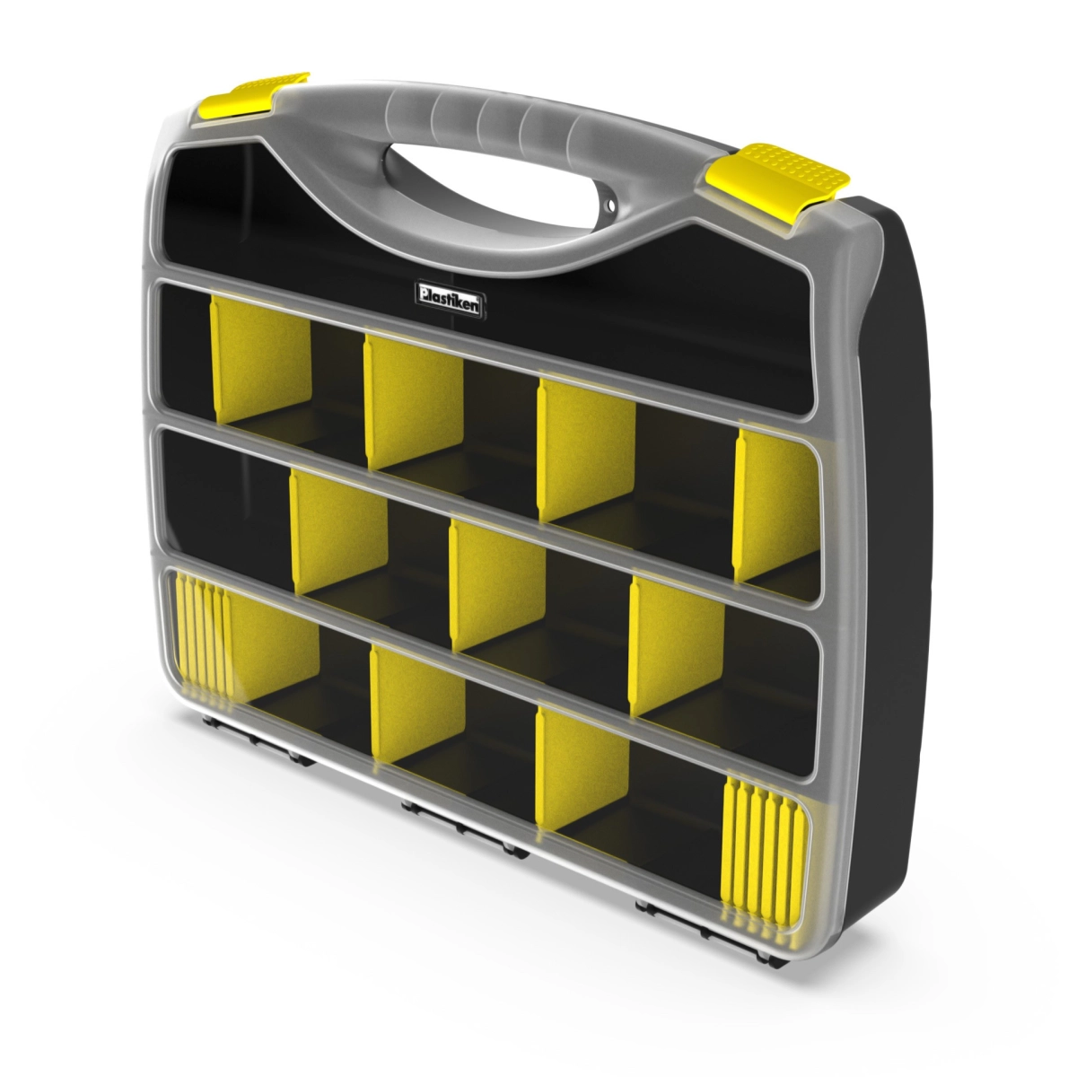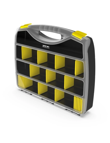 El maletín organizador PLASTIKEN Titanium de 48 cm es la solución ideal para mantener en orden herramientas, piezas y accesorios de mayor tamaño. Fabricado con materiales de alta resistencia, asegura durabilidad y protección para tus objetos. Cuenta con compartimentos ajustables que se adaptan a tus necesidades, ofreciendo espacio extra para almacenamiento. Su diseño ergonómico con asa cómoda facilita el transporte, siendo ideal para profesionales, talleres o uso doméstico. Con este maletín, funcionalidad y calidad van de la mano.