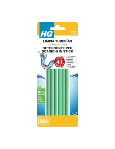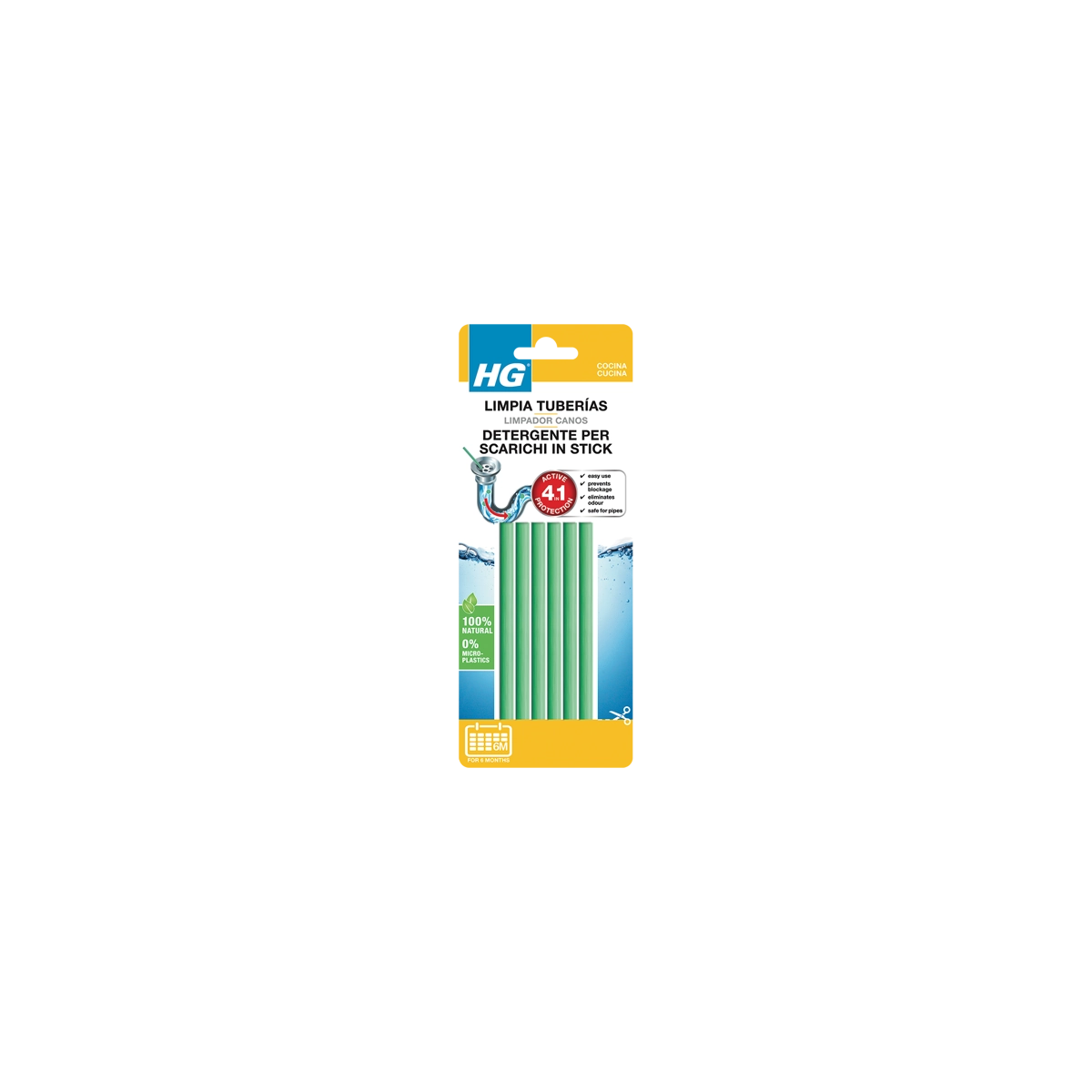 Mantén tus tuberías libres de obstrucciones con los limpiadores en sticks HG. Este pack de 6 palillos es ideal para prevenir y eliminar atascos en desagües de fregaderos, duchas y lavabos. Su fórmula activa disuelve grasa, residuos y acumulaciones orgánicas, garantizando un flujo continuo en las tuberías. Fácil de usar y seguro para todo tipo de sistemas de desagüe, los sticks HG son la solución práctica para mantener la higiene y funcionalidad de tu hogar.
