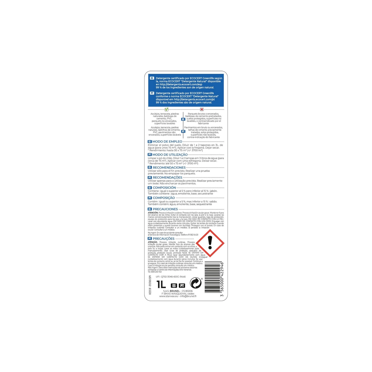 El jabón negro concentrado STARWAX al aceite de lino (1L) es un limpiador natural multiusos, perfecto para la limpieza y el cuidado de todo tipo de superficies. Su fórmula tradicional, enriquecida con aceite de lino, limpia, desengrasa y nutre eficazmente suelos, baldosas, azulejos, superficies de madera y hasta herramientas de jardín. Es un producto biodegradable y versátil, ideal para quienes buscan una limpieza eficaz y respetuosa con el medio ambiente.