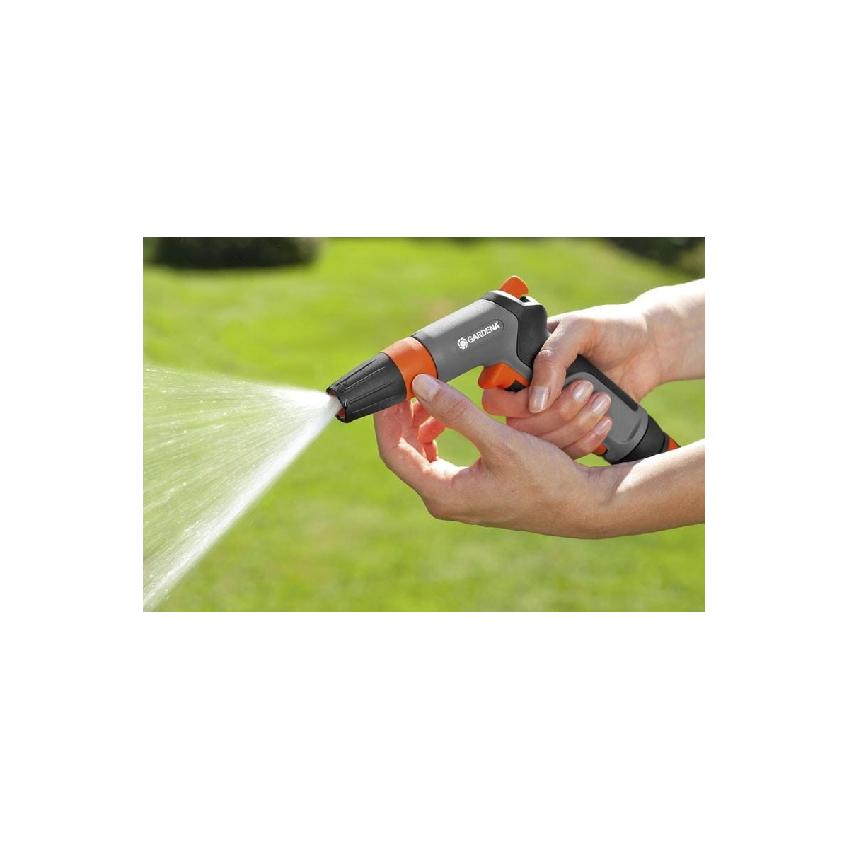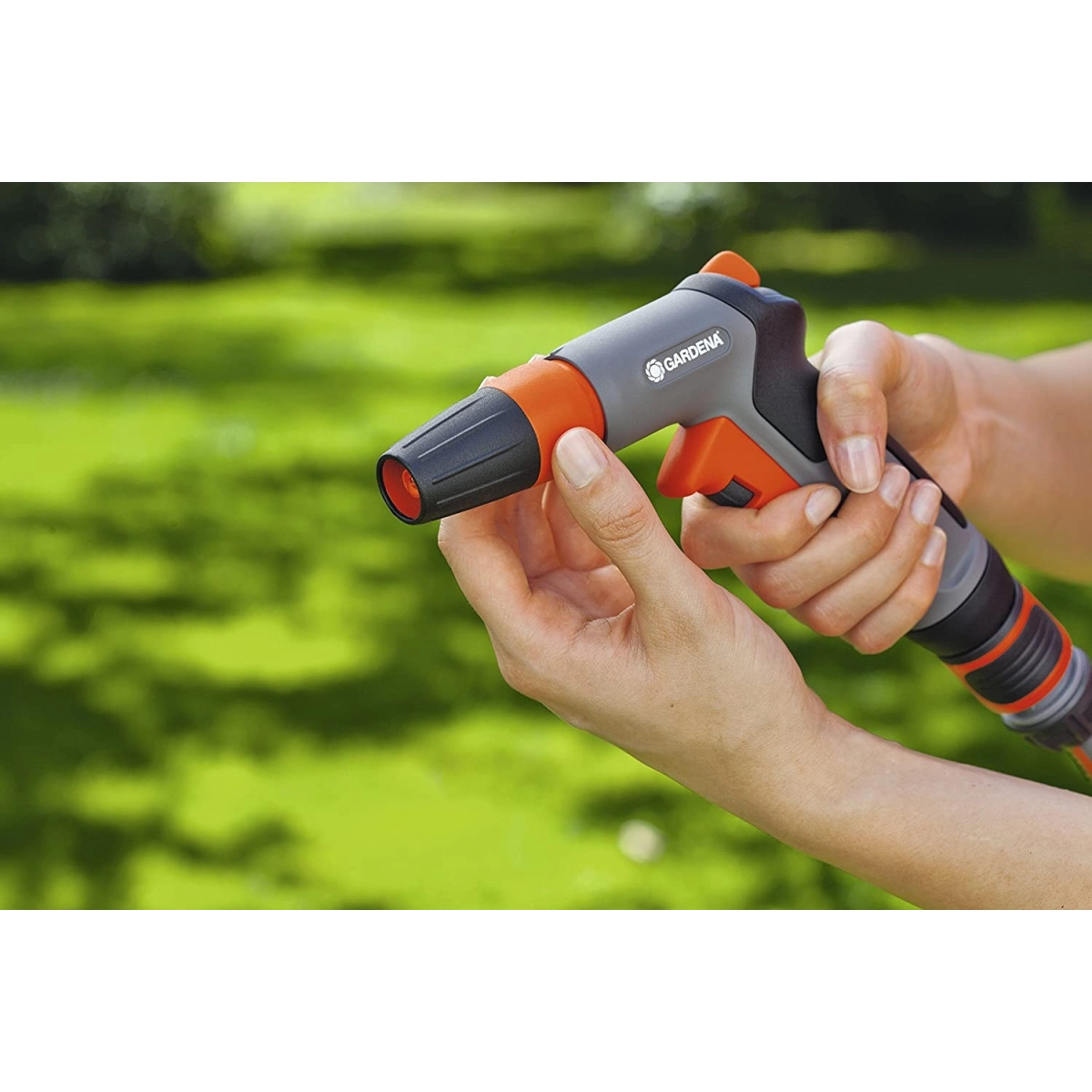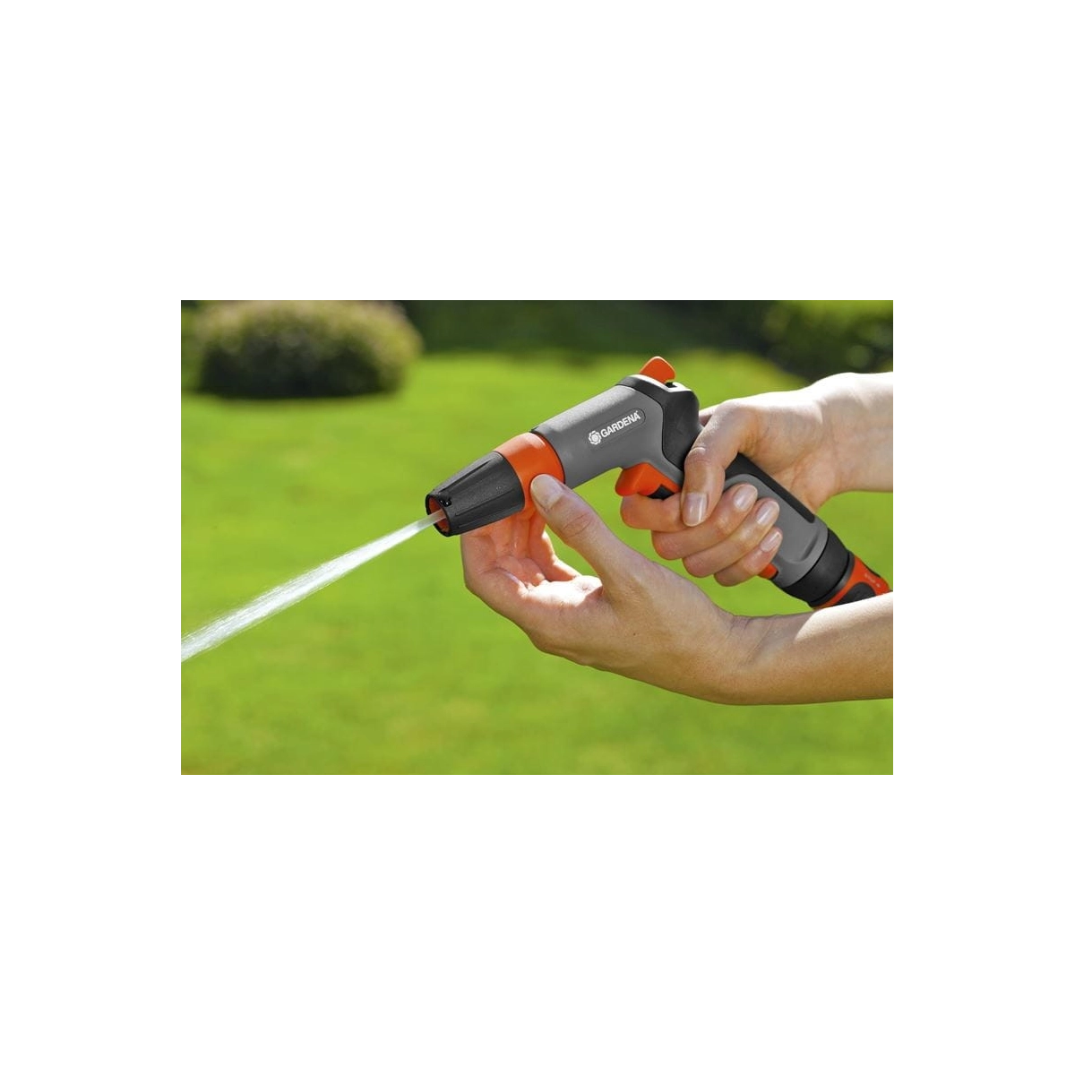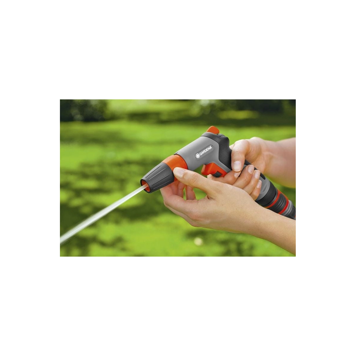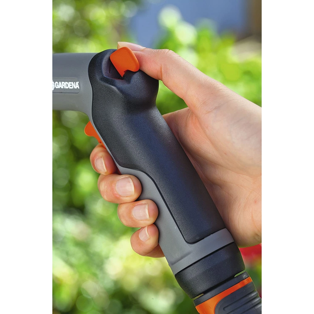 La pistola multichorro GARDENA 18301-20 permite elegir entre pulverización suave y chorro concentrado, con caudal regulable y manejo ergonómico.