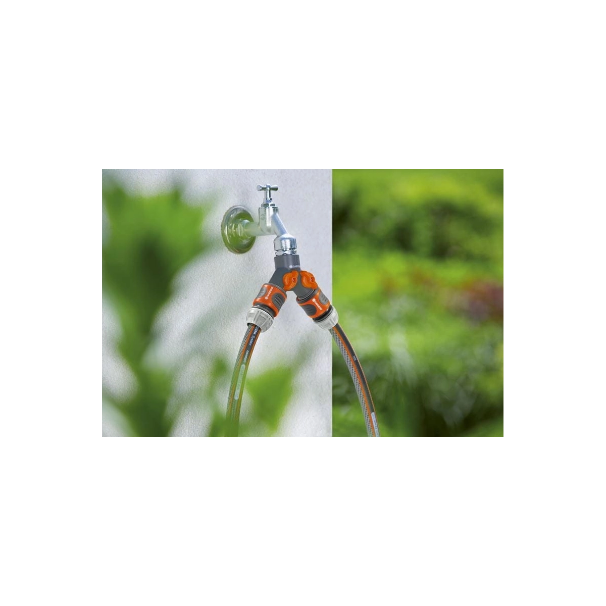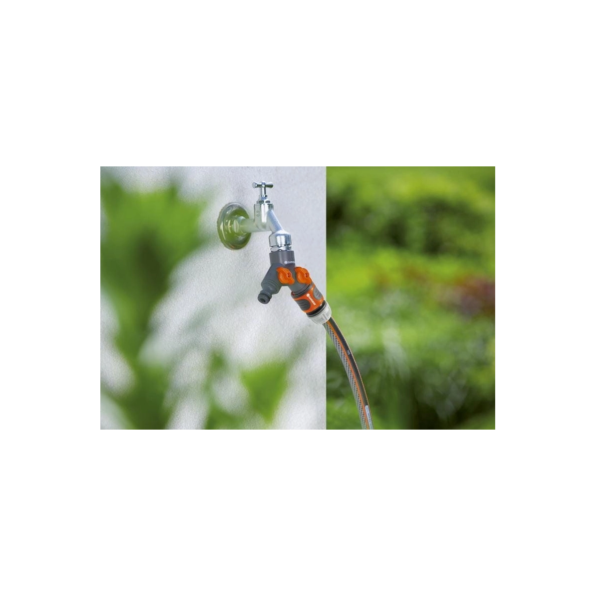 El distribuidor doble GARDENA 940-26 permite conectar dos accesorios a un mismo grifo de 33,3 mm, con caudal regulable de forma independiente.