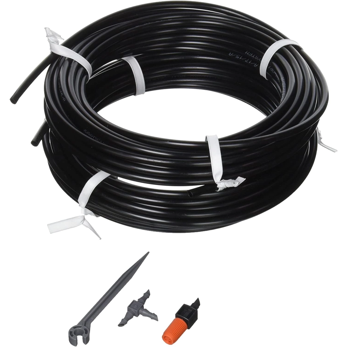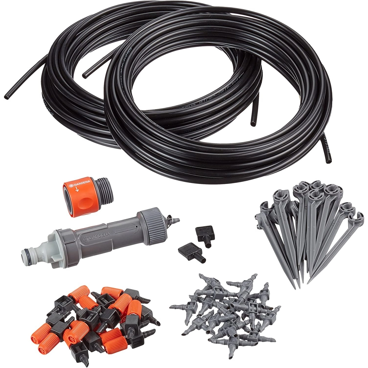 EL SET INCLUYE: 1 APARATO BASICO REDUCTOR DE PRESION 1000, 1 CONECTOR, 20 METROS DE TUBO DE INSTALACION, 15 SOPORTES DE TUBO 4,6 MM 3/16", 15 PIEZAS EN T DE 4,6 MM 3/16", 2 TAPONES DE CIERRE DE 4,6 MM 3/16" Y 15 GOTEROS FINALES REGULABLES
