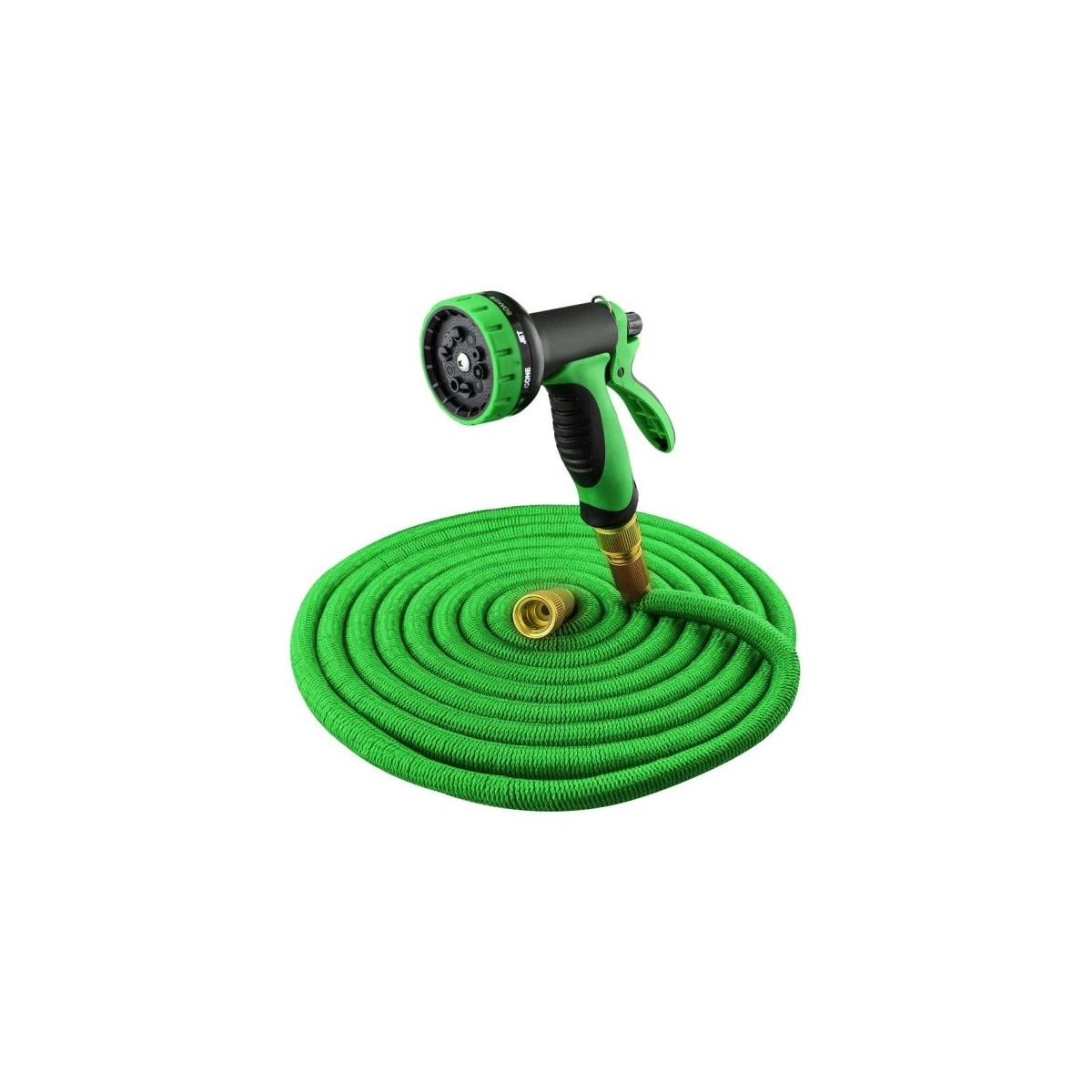 Manguera de jardín ultra flexible y resistente, se expande hasta 15 metros al llenarse de agua. Incluye accesorios de latón de alta durabilidad.