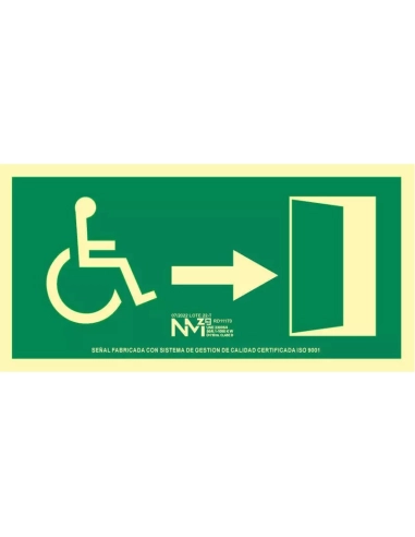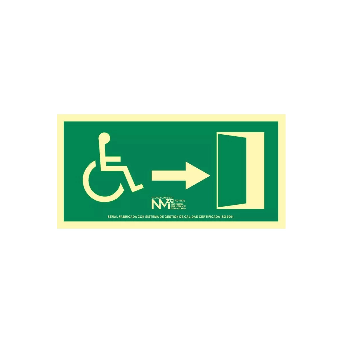 Señal luminiscente de Salida Minusválidos a la Derecha de 32x16 cm en PVC de 0,7 mm, Clase B, conforme a la nueva normativa CTE y RIPCI. Ideal para instalaciones accesibles según legislación vigente.