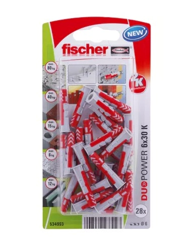El blister de tacos DuoPower 6x30 de Fischer es la solución ideal para una amplia gama de aplicaciones de fijación. Gracias a su diseño innovador y a la tecnología 2K, estos tacos ofrecen una sujeción segura y confiable en diversos materiales.