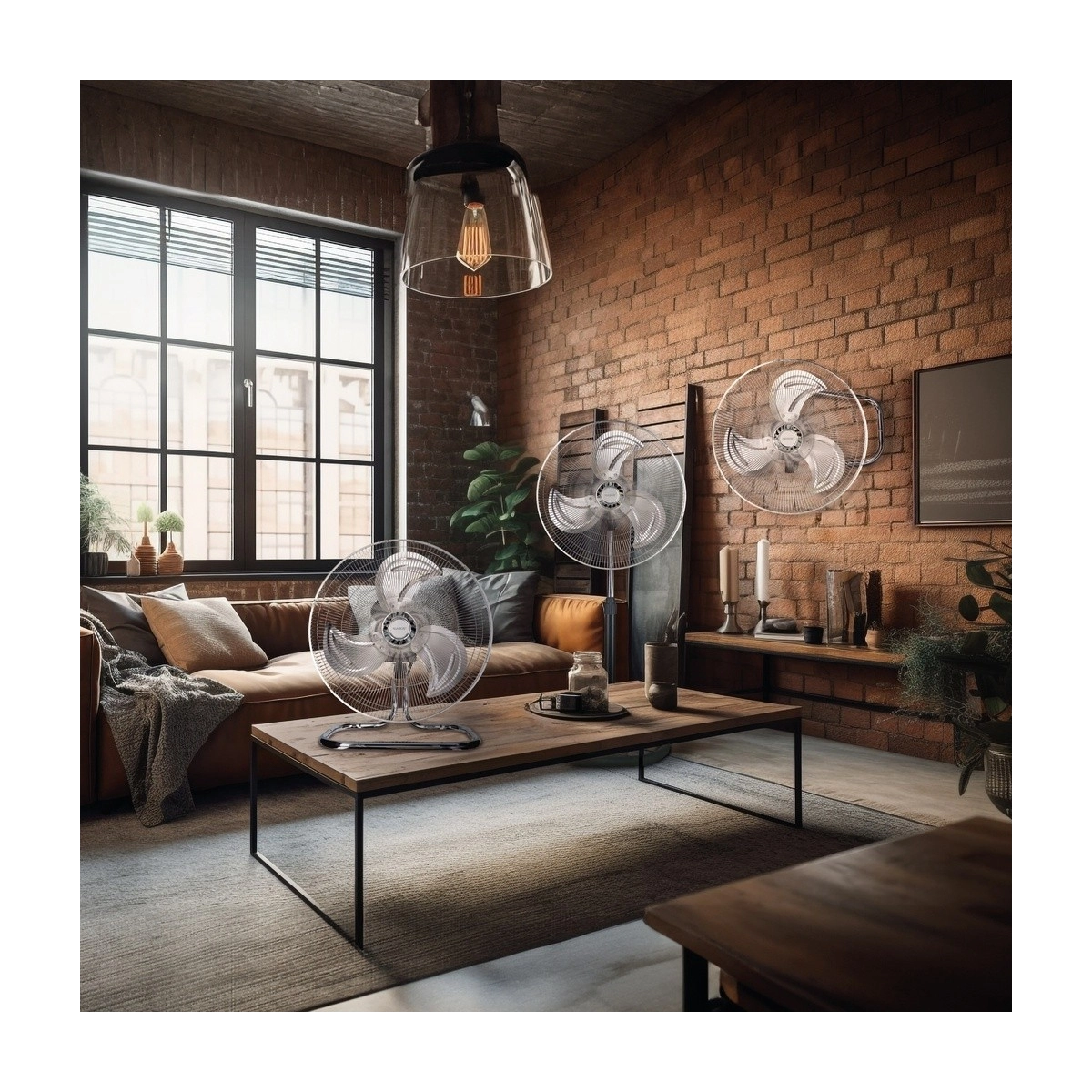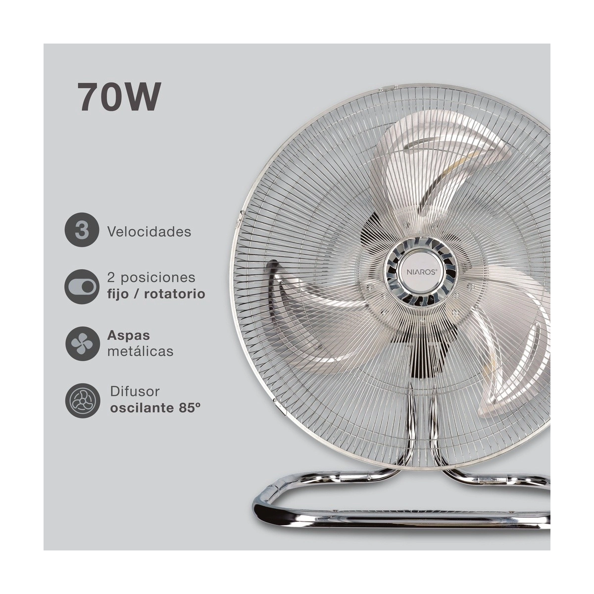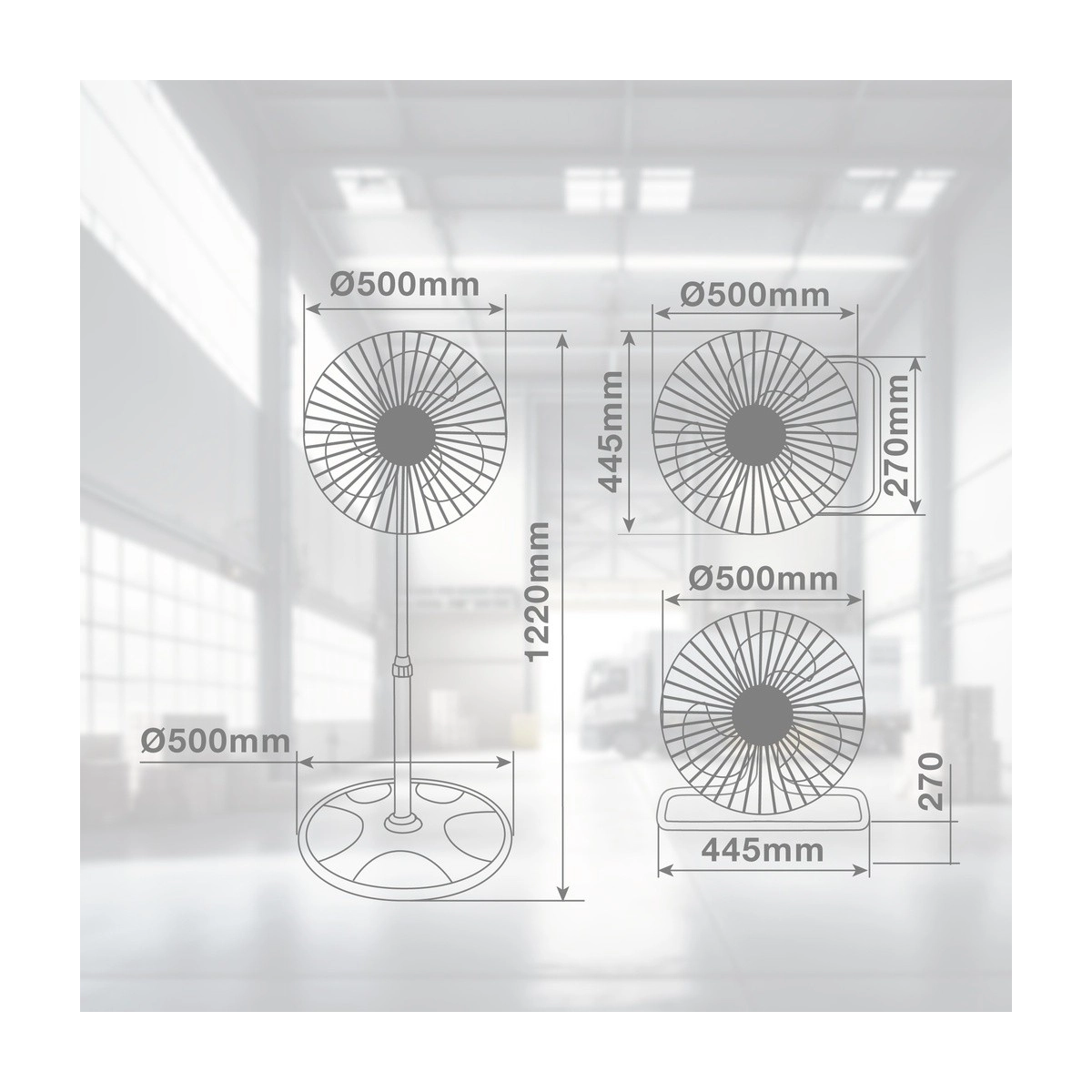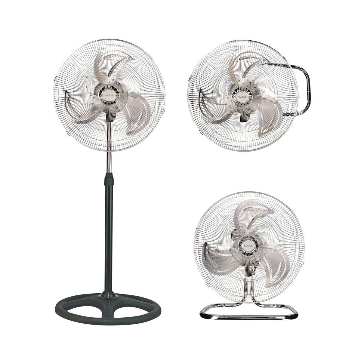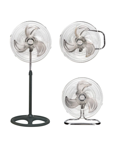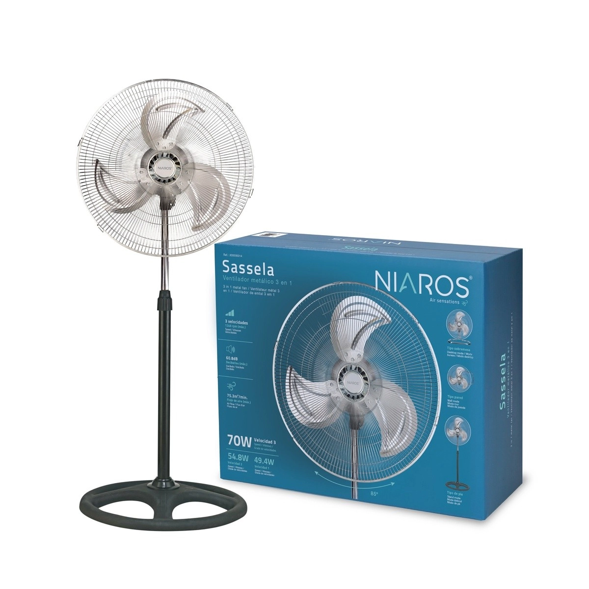 Ventilador metálico GSC Sassela 3 en 1: sobremesa, pared o pie. Diámetro de 50 cm, motor de 70W y estructura resistente.