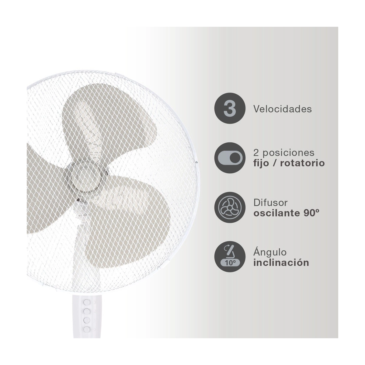 El ventilador de pie GSC Nametil ofrece una ventilación eficaz con su motor de 45W y aspas de 43 cm de diámetro. Cuenta con tres velocidades ajustables, función oscilante y altura regulable para una distribución uniforme del aire. Su diseño en color blanco lo hace ideal para cualquier entorno, desde el hogar hasta la oficina. Silencioso y fácil de montar, es perfecto para mantener el confort en los días calurosos.